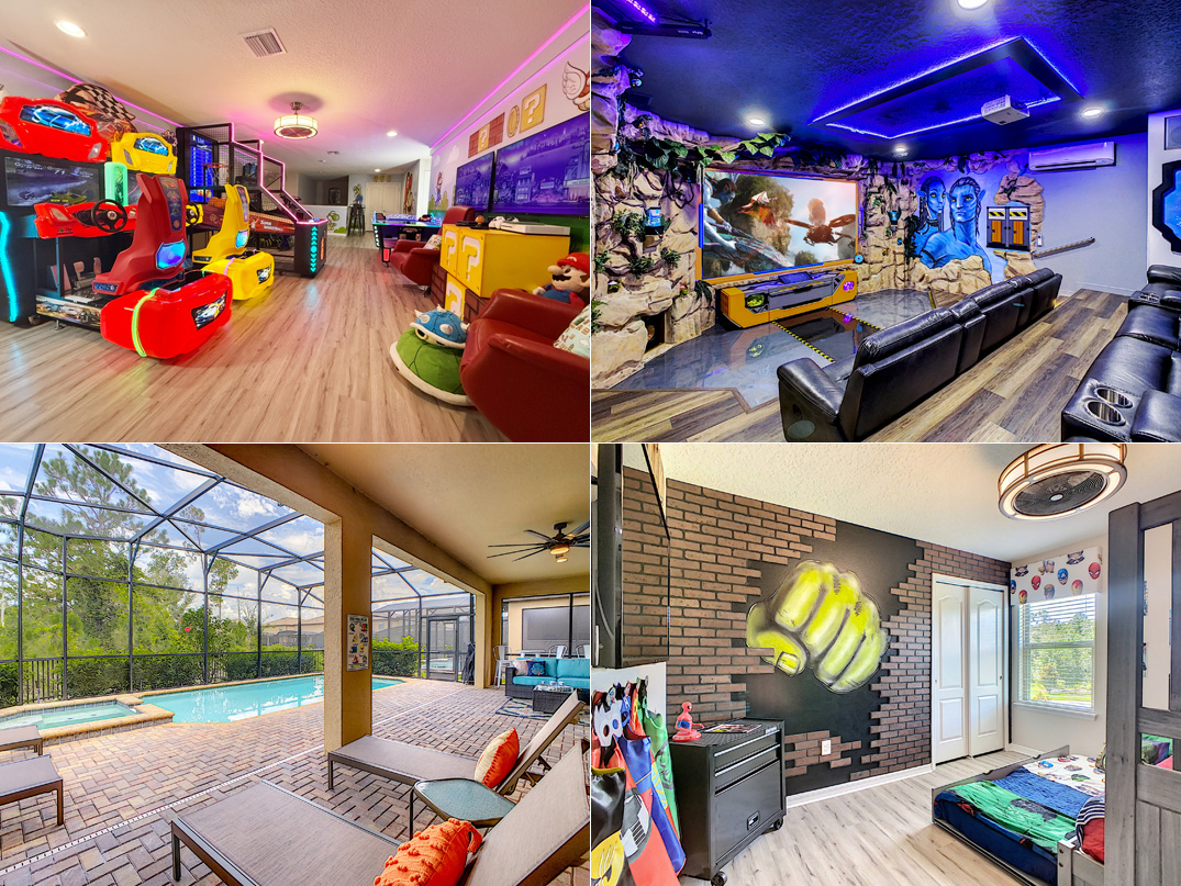 ARE YOU LOOKING for a vacation home with an incredible Super Mario themed arcade game room, Avatar themed movie theater, poolside movie theater and bar counter with TV, a private west facing pool and spa, totally renovated and professionally decorated home in Windsor At Westside Resort with its beautiful clubhouse and water park, and is close to Disney World? This is it!